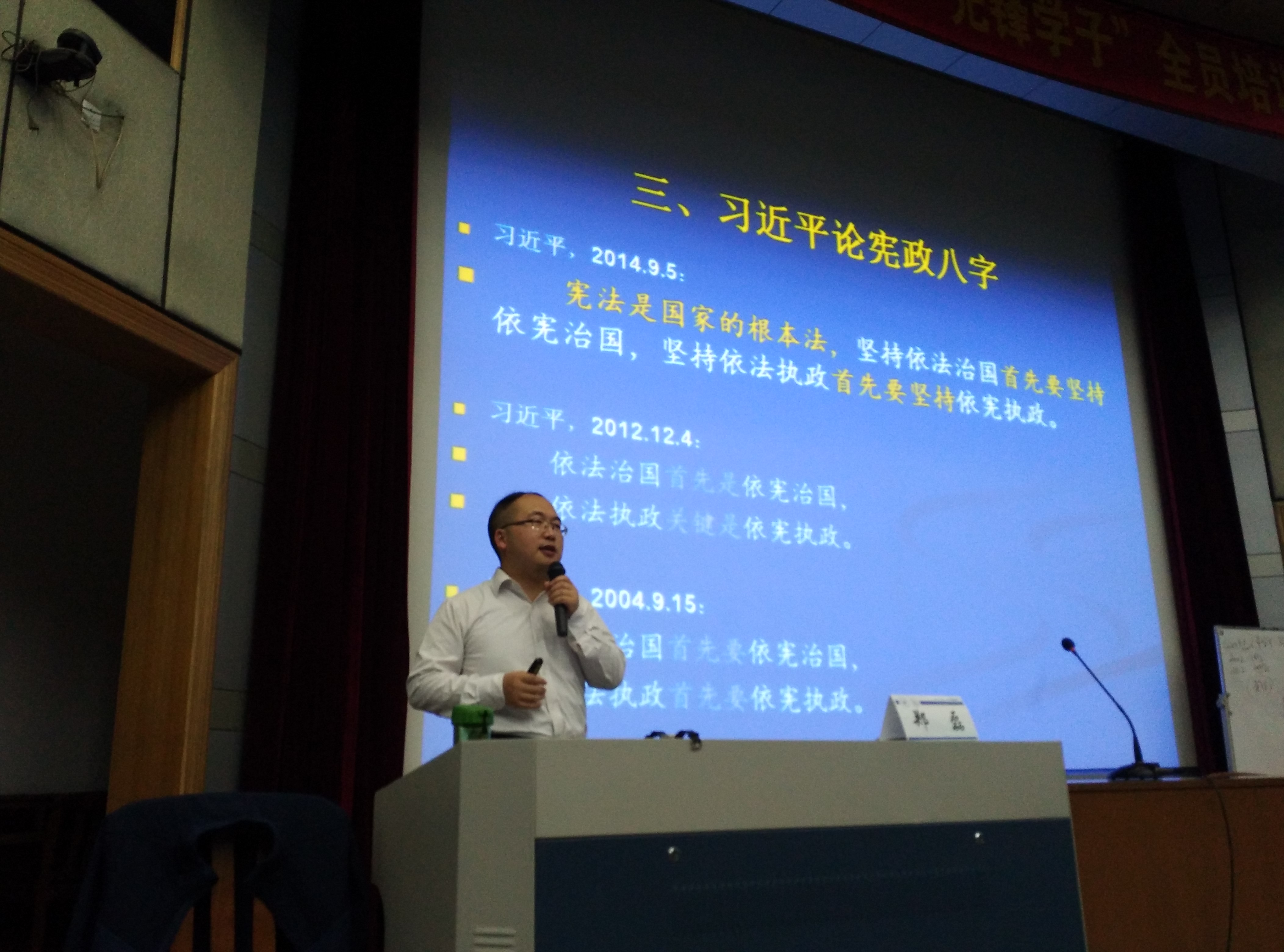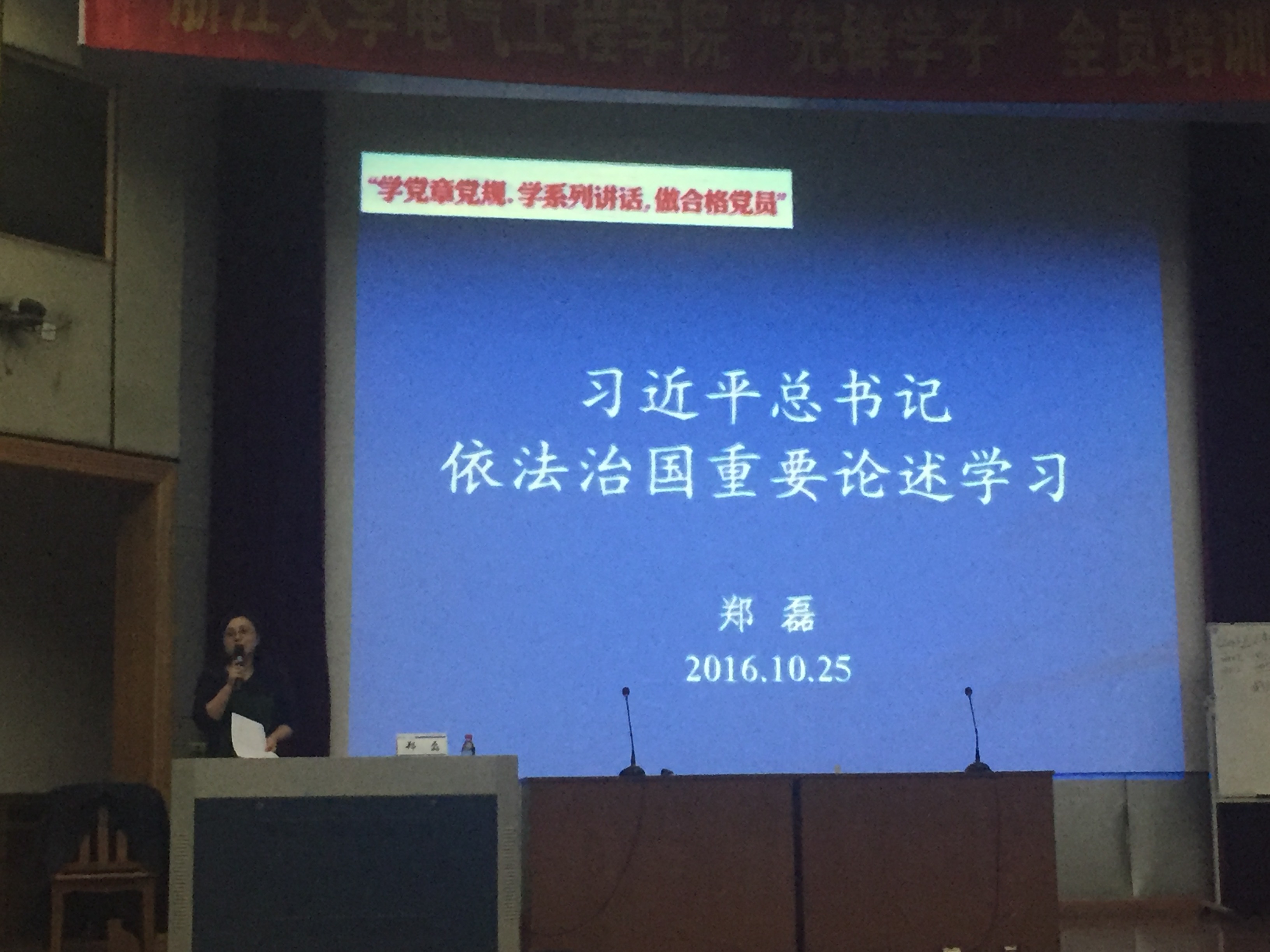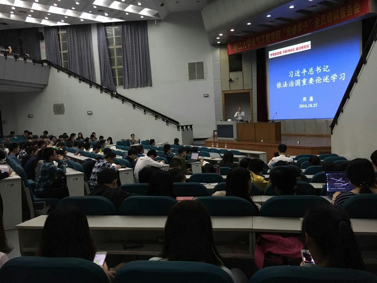 10月25日,mg4355线路检查官网“先锋学子”全员培训暨“两学一做”专题学习第五场报告会在玉泉校区教七影视厅举行。本次报告主讲嘉宾为mg4355线路检查官网光华法学院副教授郑磊老师,由学院党委副书记陈敏老师主持,参加此次报告会的还有学院老师代表和全体学生党员。