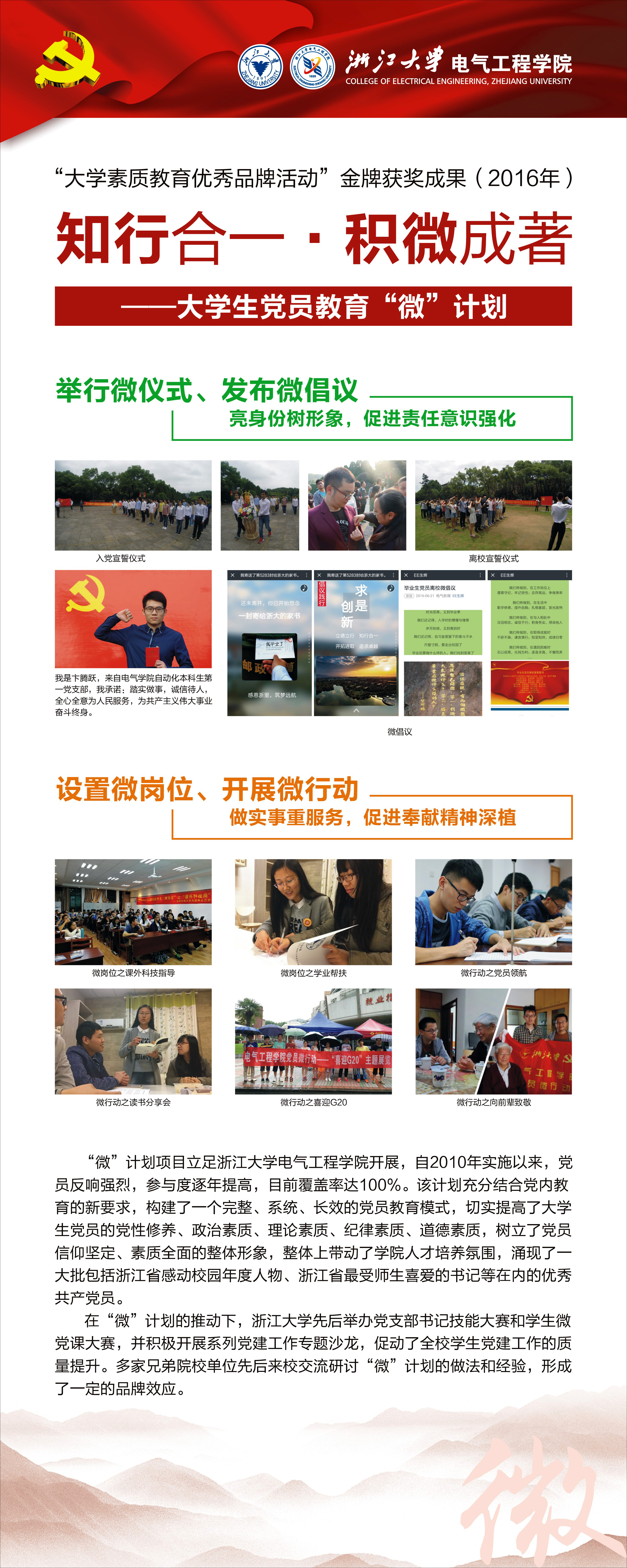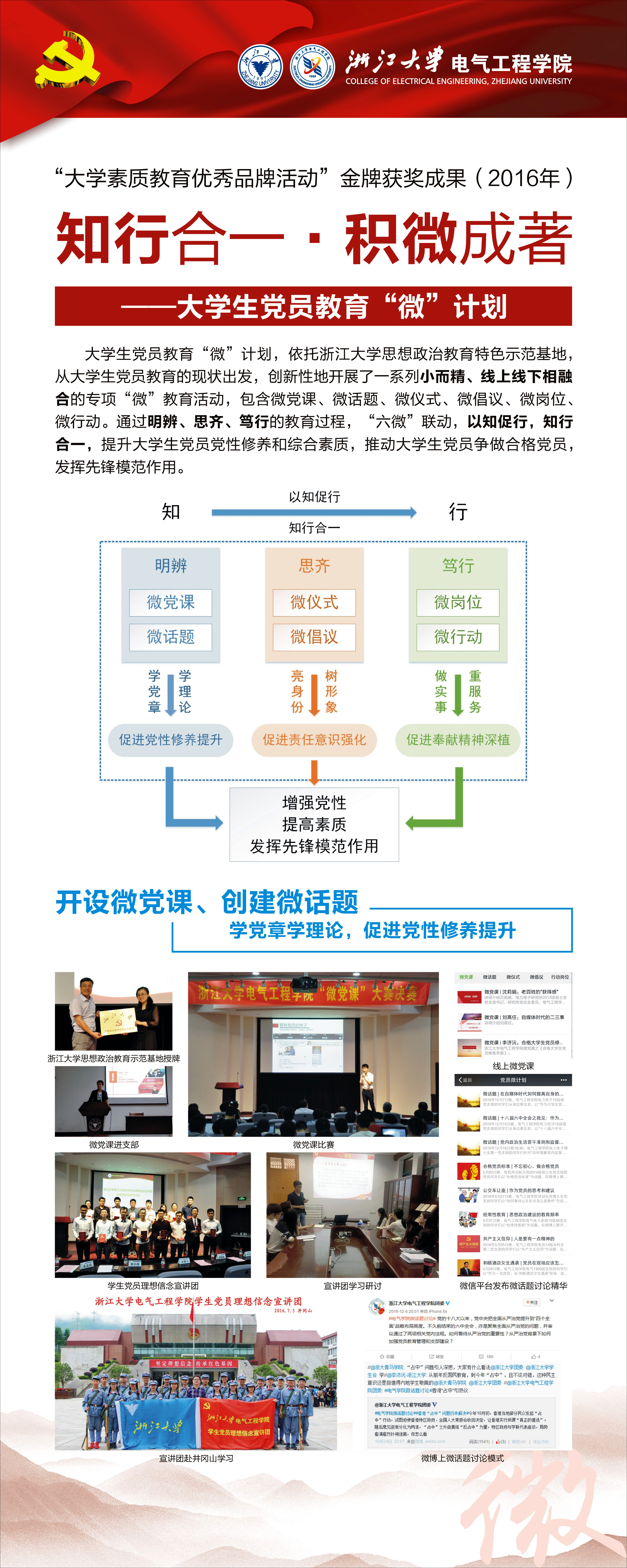 大学生党员教育“微”计划,依托mg4355线路检查官网思想政治教育特色示范基地,从大学生党员教育的现状出发,创新性地开展了一系列小而精、线上线下相融合的专项“微”教育活动,包含微党课、微话题、微仪式、微倡议、微岗位、微行动。通过明辨、思齐、笃行的教育过程,“六微”联动,以知促行,知行合一,提升大学生党员党性修养和综合素质,推动大学生党员争做合格党员,发挥先锋模范作用。