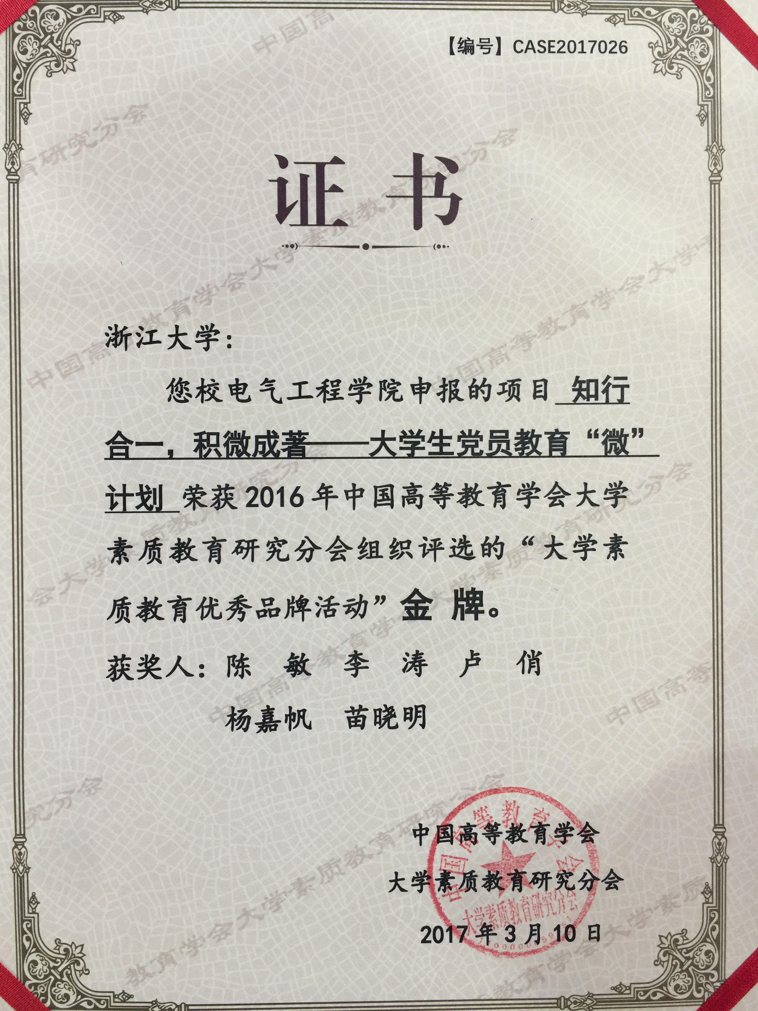 3月10日,中国高等教育学会大学素质教育研究会分会2017年会暨第六届大学素质教育高层论坛在南京农业大学举行。会上对2016年“大学素质教育优秀品牌活动”获奖项目进行了表彰,mg4355线路检查官网申报的“知行合一,积微成著——大学生党员教育微计划”荣获金牌,这是中国高等教育学会对我院素质教育工作的肯定和鼓励。