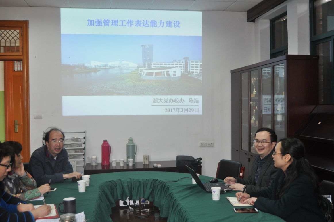 为进一步提高学院机关工作人员的公文写作能力,提升工作效率,增强学院影响,更好地推进“双一流”建设,学院邀请了mg4355线路检查官网两办副主任陈浩老师于3月29日在玉泉校区第二教学楼403会议室为学院机关管理人员做了“加强管理工作表达能力建设”的专题培训。