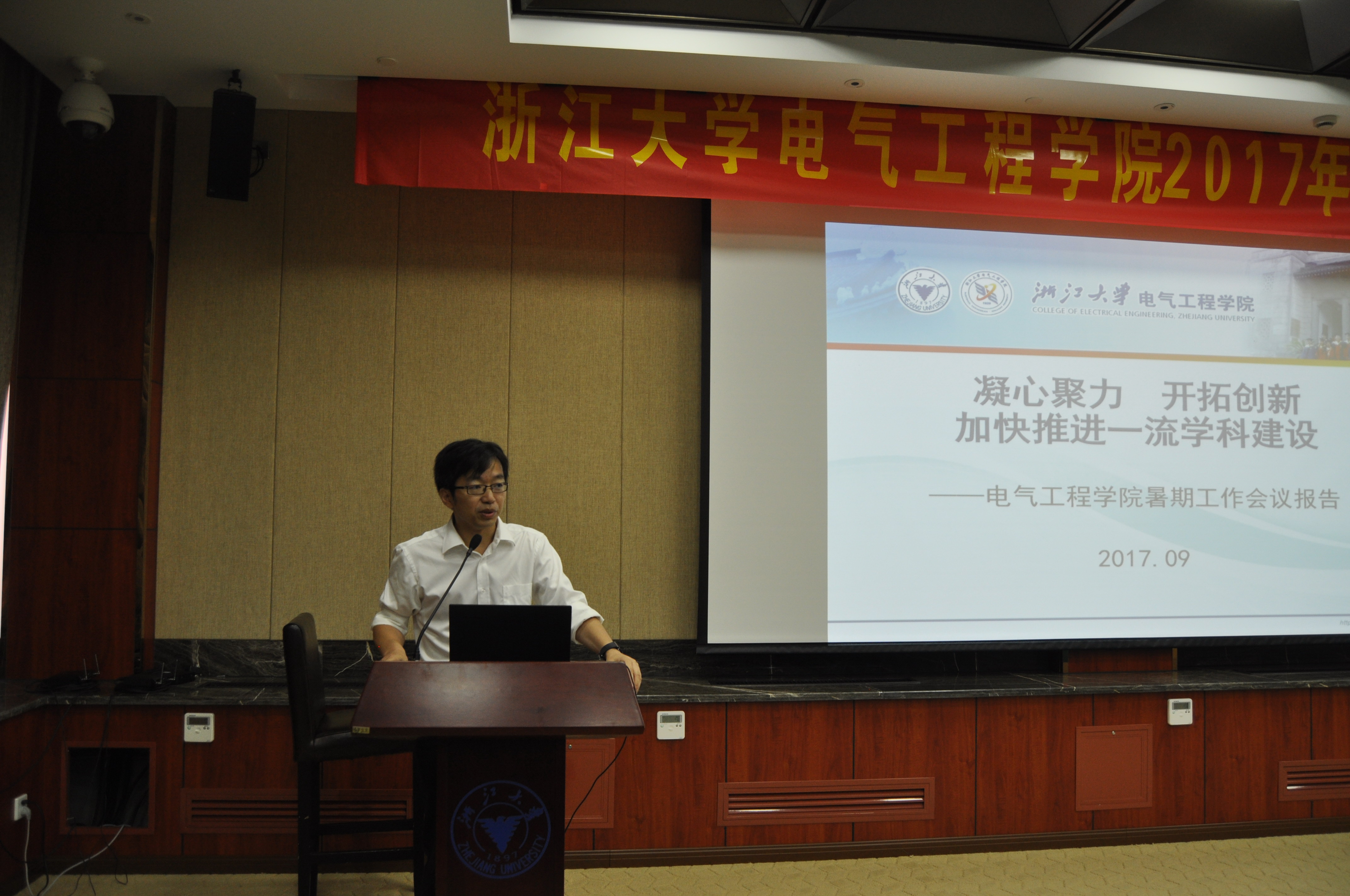 盛况院长做了首次工作报告。他首先向与会教师传达了学校暑期工作会议精神,简要阐述了学校推进“双一流”建设的目标和任务,系统回顾了学院上半年的工作情况。暑假期间,学院分别组织骨干教师、青年教师召开了一流学科建设交流研讨会,初步形成了电气工程一流学科建设的思路。在此基础上,盛院长进一步阐释了新班子对电气工程一流学科建设的思考,深入剖析了一流学科建设的目标和战略、任务和要求。世界科技前沿快速发展,突破性思想、颠覆性技术、革命性产业层出不穷,在学校推进“双一流”建设的目标规划中,电气学科作为历史悠久、底蕴深厚、传承丰富、实力雄厚的学科,当以“中国特色、世界一流”为核心,一流为目标、学科为基础、绩效为杠杆、改革为动力,从人才培养、师资队伍建设、科研创新、社会服务、国际合作、学科交叉等各方面全面推进学科的建设和发展,努力使学科成为国际电气工程领域高层次人才培养的摇篮、解决国家重大关键科学问题的创新与服务基地以及全方位多层次国际学术交流的平台,率先跻身世界一流学科行列。