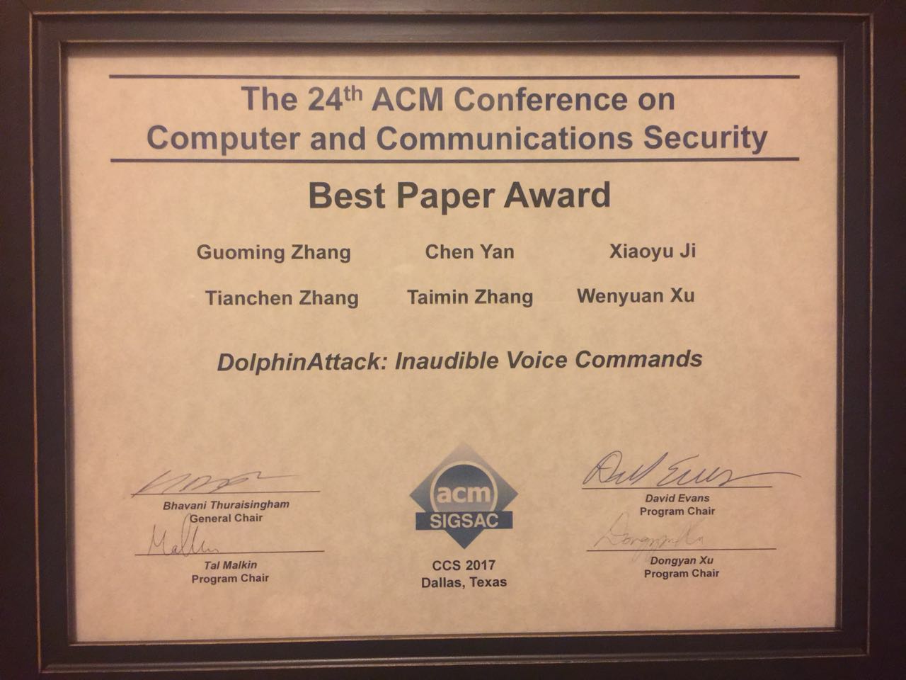 来自mg4355线路检查官网徐文渊教授团队(USSLAB)的论文Dolphin Attack:Inaudible Voice Commands经过层层选拔,从840多篇论文中脱颖而出,被ACM CCS 2017录用。值得一提的是,包括来自麻省理工大学、加州大学伯克利分校、马里兰大学等11篇论文被提名(占总投稿的1.3%, 11/846),而Dolphin Attack: Inaudible Voice Commands经过为期6周、3轮组委会的严格投票,最终荣膺最佳论文奖(5/846)。这是国内高校和研究机构首次获得该会议的最佳论文奖,是中国研究人员在国际网络及信息安全领域的一次重要突破。