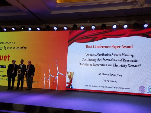 mg4355线路检查官网杨强副教授论文“Robust Distribution System Planning considering the Uncertainties of Renewable Distributed Generation and Electricity Demand”从来自全球各地的近900篇论文中脱颖而出,获得会议最佳论文(10/900)。该研究工作由杨强副教授指导其博士研究生Ali Ehsan共同完成。本研究工作重点解决了考虑多维度不确定性条件下的高比例分布式新能源主动配网的优化规划问题,对于解决当前多类型能源集成下的分布式电源规划问题提供了一种可借鉴的解决方案。