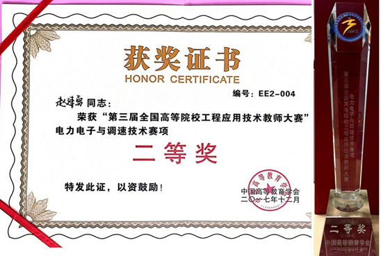 来自清华大学、mg4355线路检查官网、西安交通大学、武汉大学、哈尔滨工业大学、山东大学等100余所高校386支队伍参加了比赛。大赛分为初赛和决赛两个阶段,经过初赛筛选,最终有215支队伍成功进入决赛。决赛阶段,大赛成立了由清华大学吴澄院士、mg4355线路检查官网孙优贤院士、谭建荣院士、北京大学高松院士等10位院士组成的专家委员会,亲临比赛现场指导点评,现场裁判和评审专家全部来自国内高校和科研院所的高级专家。我院赵建勇老师提交的任务书成功通过初赛评审,在复赛阶段经过工程实践操作、目标命题实现及答辩环节,最终获得了“第三届全国高等院校工程应用技术教师大赛”电力电子与调速技术项目组的二等奖,得到了评审专家的称赞和认可。