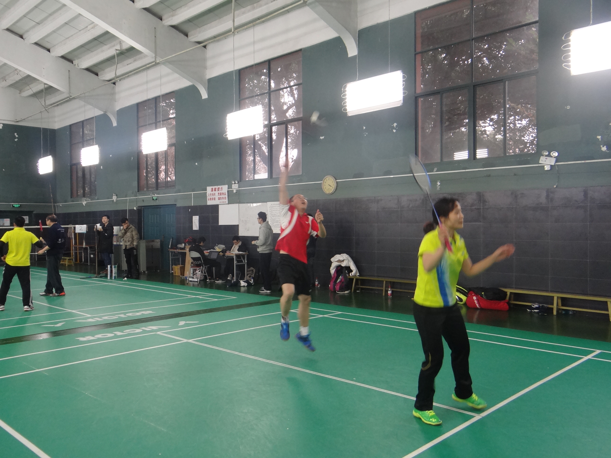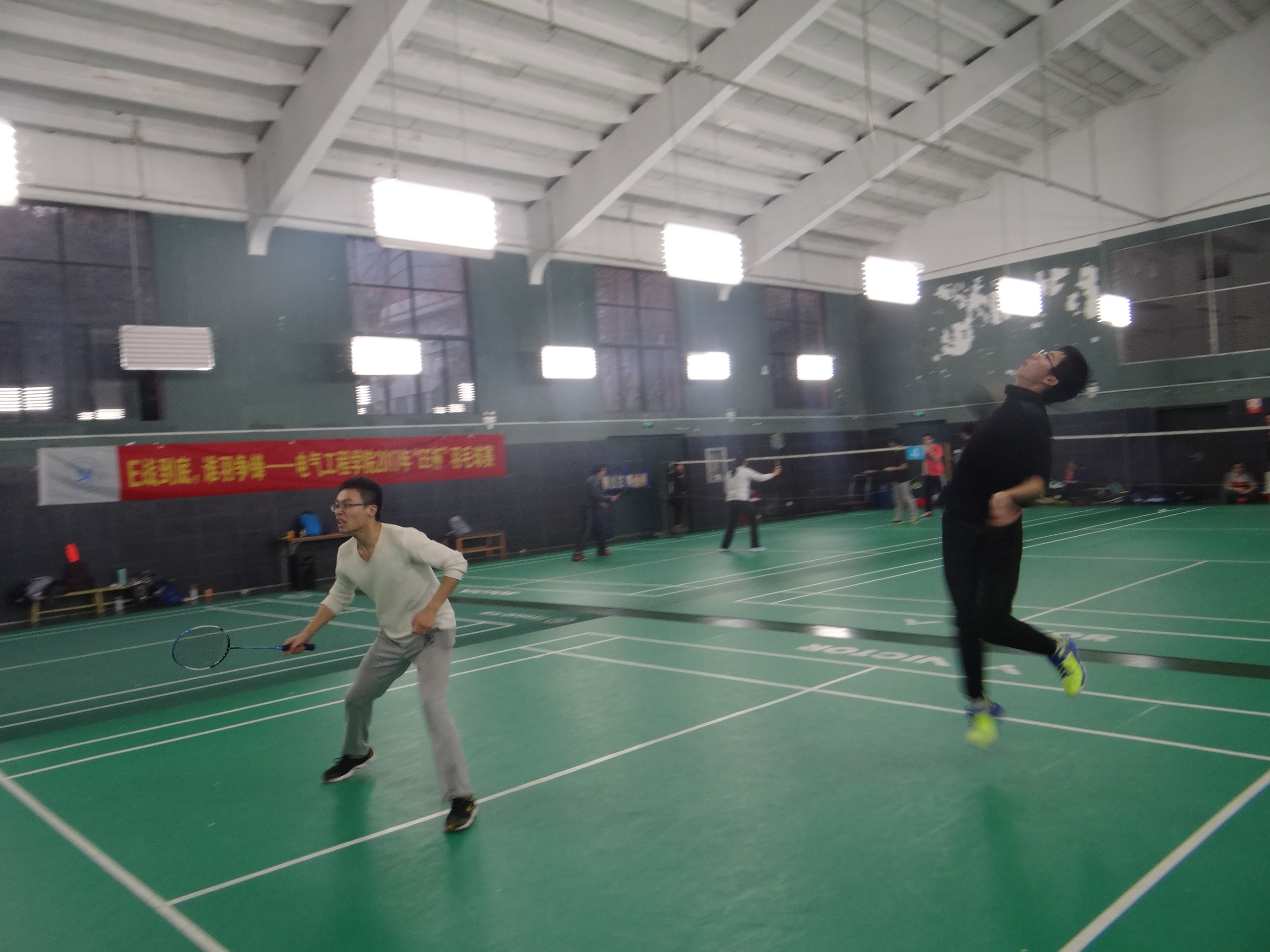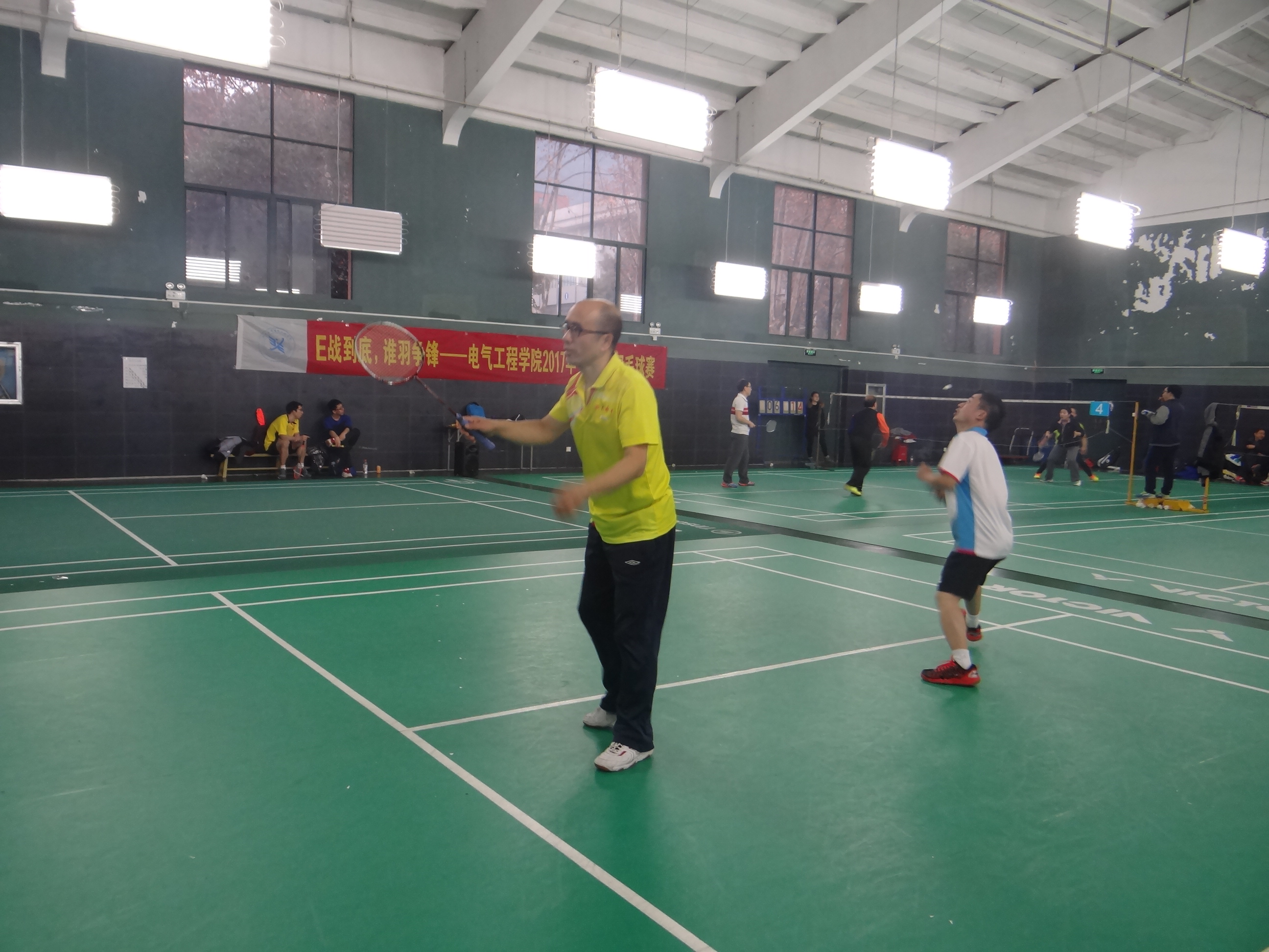 在进行完分组后,战斗打响。学生组和老师组如同针尖对麦芒,互不相让,精彩纷呈,让人眼花缭乱。学生们充满了激情和热血,老师们则有着沉稳的心态和丰富的经验,两组的表现各有千秋,互有胜负,接连打出让人叹为观止的“神球”。比赛中,亮白色的羽毛球在空中划出一道道优美的弧线,选手们矫健的身姿,熟练的技术,完美的配合与他们脸上的汗水,不屈不挠的精神交相辉映,展现出电气人不一样的风采。