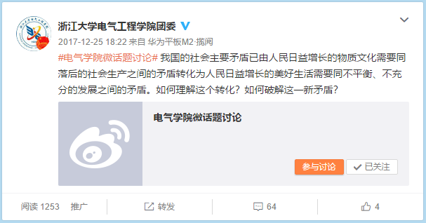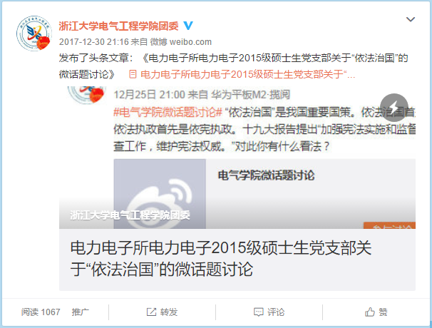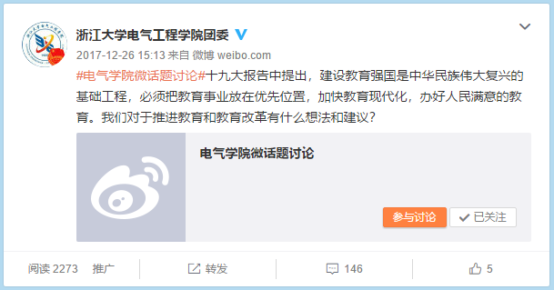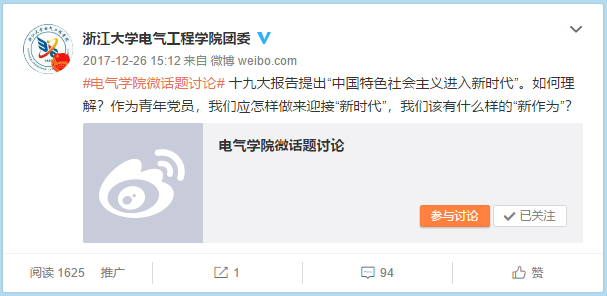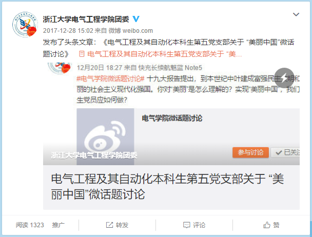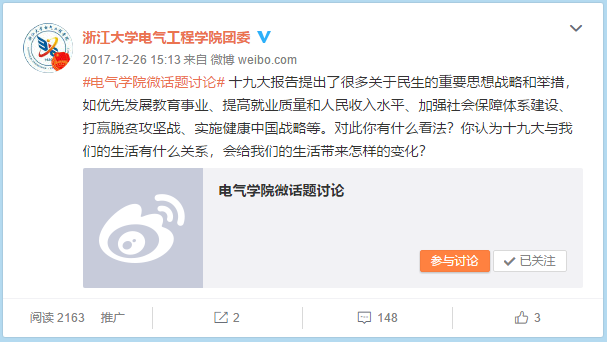 “微话题”活动是mg4355线路检查官网党员主题教育基地“微计划”的重要内容,此次“微话题”活动以十九大报告和新党章学习讨论为主题,进一步推进了学院党员深入学习、宣传、贯彻党的十九大精神,有效拓展了党员学习的时空,极大丰富了学习的内容与形式。“微话题”活动以促进学生党员的素质提升为根本目的,充分发挥党员主体作用,学生积极主动参与,党员自我与互相教育,以“小而精”的活动方式,在思维碰撞中发出浙大学子自己的声音。