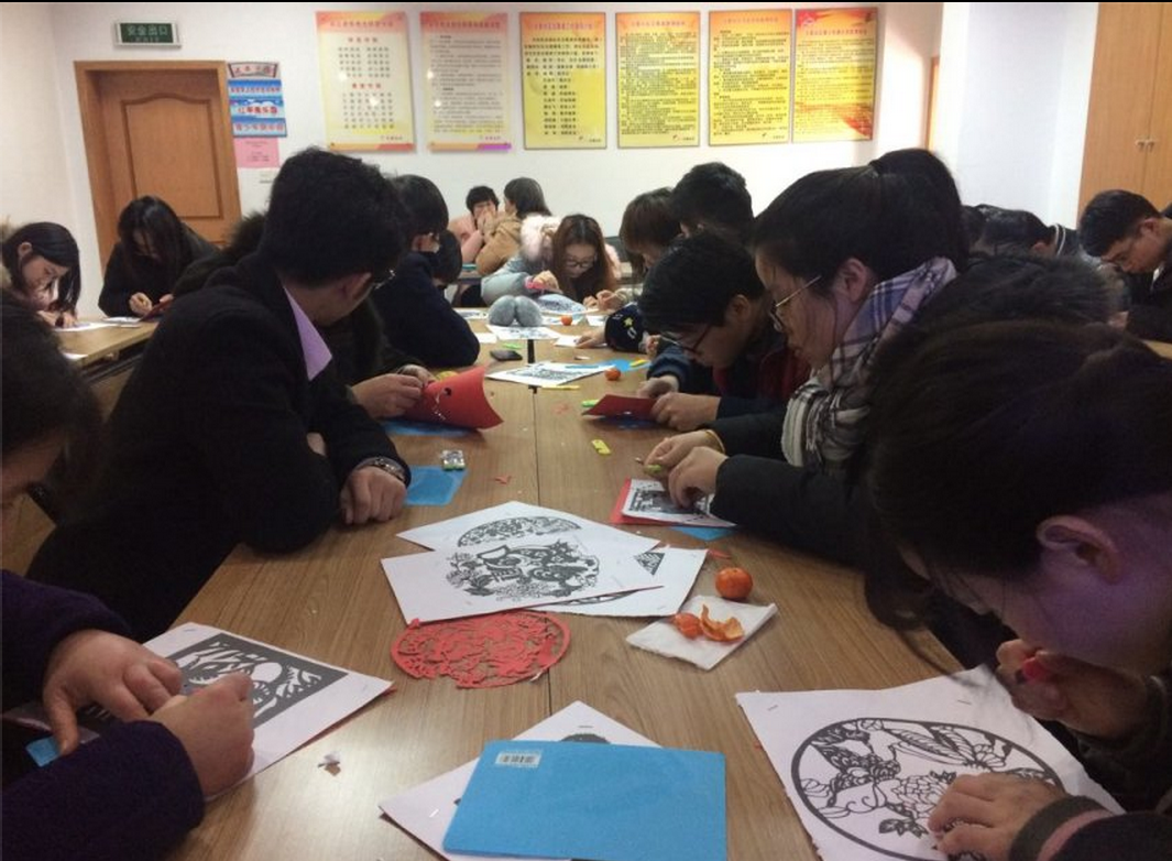 刚结束会议的老党员们都对我们的剪窗花活动展现了饱满的热情:或是询问,或是围观,继而纷纷上手开始了尝试。我们的志愿者们“卖弄”了几把前几日刚刚掌握的剪纸技能,将自己为数不多的经验、剪窗花过程中的小技巧分享给老党员们,过了一把传道受业解惑的瘾。下图便是当时如火如荼的场景,放下手机和电脑,拿起小刀和彩纸,沉迷剪窗花的时间里,秒针仿佛也慢下了追赶的步伐。