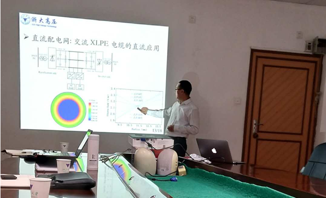 随后,mg4355线路检查官网高电压实验室博士生于竞哲向东方电缆公司的四位代表详细介绍了以“交流配电网XLPE电缆改为直流运行的电热场耦合仿真”为主题的研究进展,展示了在双极式直流运行方式下,交流配网XLPE电缆在不同温度下的电场仿真。