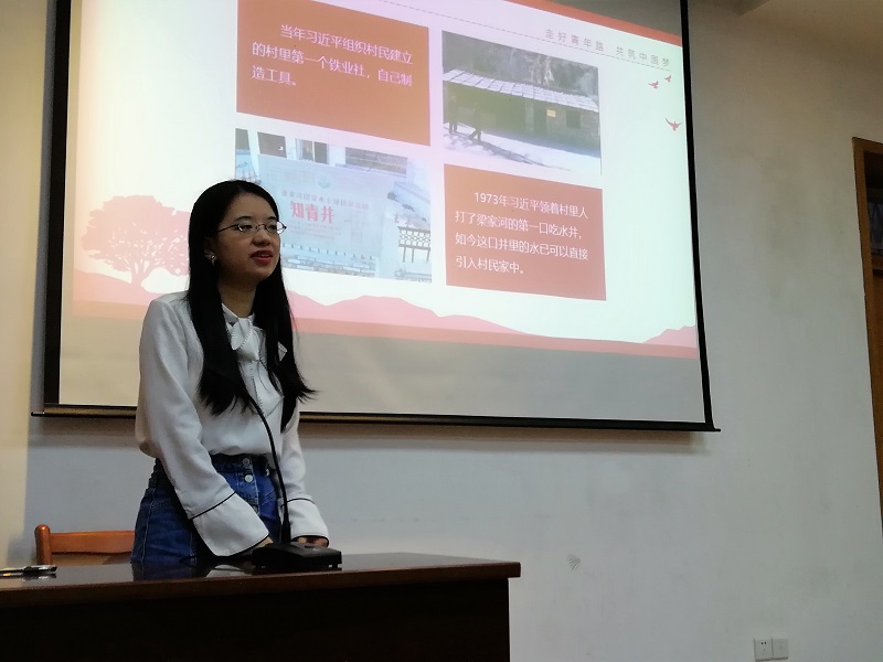 首先,刘亚男同学做了主题为“走好青年路,共筑中国梦”的党课演讲。刘亚男同学结合自己去延安参观的切身感受,带领同学们回顾了习近平主席在延安梁家河时期的知青岁月。无论是困窘生活下的坚持读书求知,还是困难重重下的坚持入党,亦或是作为村支书的种种创举,习主席的知青岁月向我们诠释了“有理想,有本领,有担当”的真正内涵。青年兴则国家兴,青年一代应当将自己的理想信念根植于伟大的中国梦中,在为祖国的建设中发挥自己的价值。