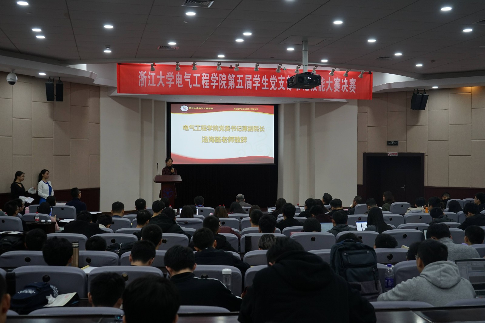 比赛前由汤海旸老师致辞,围绕“立德树人,以身为本”的思想,在肯定了电气学院学生党建工作的基础上,提出电气学院基层党组织建设及党员的培养要进一步对标一流,突出电气人的特色,希望青年学子学习历代浙大人忠诚担当、无私奉献的求是创新精神。