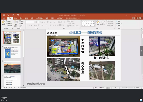 而孙晓伟同学所在的武汉市区是疫情的重灾区。她谈到:武汉市区超过百分之八十的小区都存在确诊病例,在疫情危重的时期她的心情十分低沉抑郁,为生活了二十多年的城市感到痛心疾首。幸运地是,在国家的全力支持和一线医护工作者的浴血奋战下,武汉的疫情最终被控制住,相信在本月能够实现新增确诊病例的清零。晓伟同学为我们展示了自己拍摄的真实照片,工作的表姐、楼下的救护车、爱心冬瓜,几幅图片清晰地记录下从政府到人民群众在这场战“疫”中的付出与担当。武汉市所有公务员及部分国企人员全部参与防疫工作,政府对街道社区进行周密管控,社区统一生活物资调配,正是这一项项举措和每个人的实际行动才让这场巨大危机迎来了黎明的曙光。