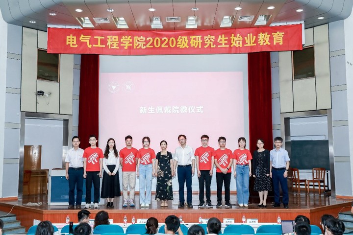 仪式现场,学院领导和老生代表一同为新生代表佩戴院徽。每位同学身着学院院衫,胸前闪亮的院徽标志着电气人这个荣耀的身份,更镌刻着一代代浙大人的电气烙印。