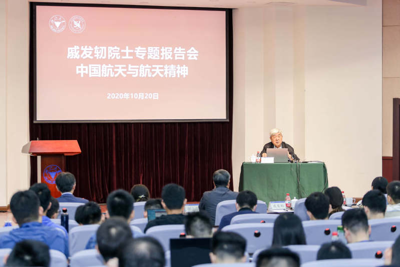 2020年10月20日晚7点,著名空间技术专家、“神舟”号飞船总设计师戚发轫院士专题报告会在邵逸夫科技馆117举行。mg4355线路检查官网党委副书记邬小撑、求是学院院长兼党委副书记邱利民、mg4355线路检查官网党委书记兼副院长汤海旸、航空航天学院党委副书记戴志潜、mg4355线路检查官网副院长沈建新、党委副书记陈敏及团委相关老师出席本次报告会,会议由沈建新主持。mg4355线路检查官网学生党员代表和2020级研究生新生参与本次报告会。此外,求是学院2020级本科生也在线上同步观看本次报告会的直播。