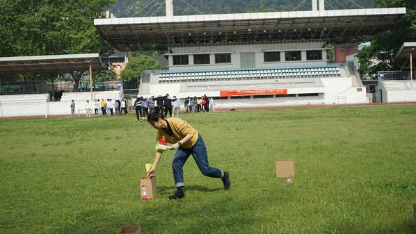 本届运动会积分赛共设立投弹比赛、绑腿行军、红军过草地、送鸡毛信、扫雷接力、踢毽子六个正式比赛项目,每个比赛项目按照积分制形式对前八名依次计分,最终按照每支队伍的总分排出比赛名次。项目设计将红色元素融合其中,师生在团结协作中,重温我们党在这一百年中走过的风雨。投弹比赛项目中,模拟战场上的投弹手,队员们用沙包瞄准靶纸,抛出优美的弧线命中靶心;绑腿行军项目中,大家喊着“一二一二”的口号,通过练习,从互相搀扶到奔跑向前;红军过草地项目中,运动员协同合作,传递四个垫子拼接前进,避免陷入“沼泽地”;送鸡毛信项目中,队员用筷子夹起乒乓球跑向对面,顺次接力,既要保证速度,又要保持平衡;扫雷接力项目中,模拟战场扫雷插旗标注,队员们在多个点间寻求最佳路线,将小旗依次放入盒子中;踢毽子项目中,队员们默契合作,灵活流畅的配合让人惊叹,引来阵阵喝彩。