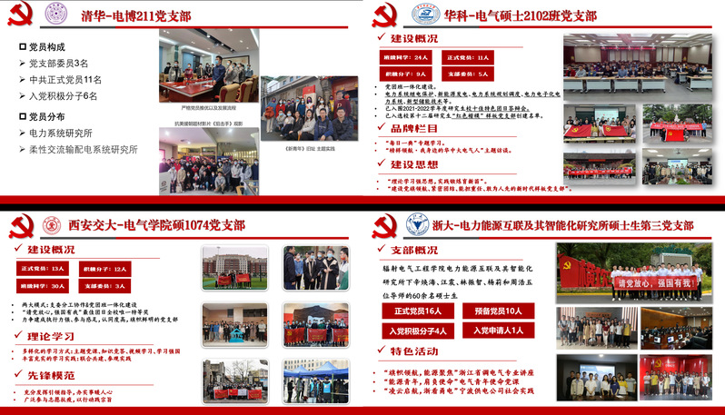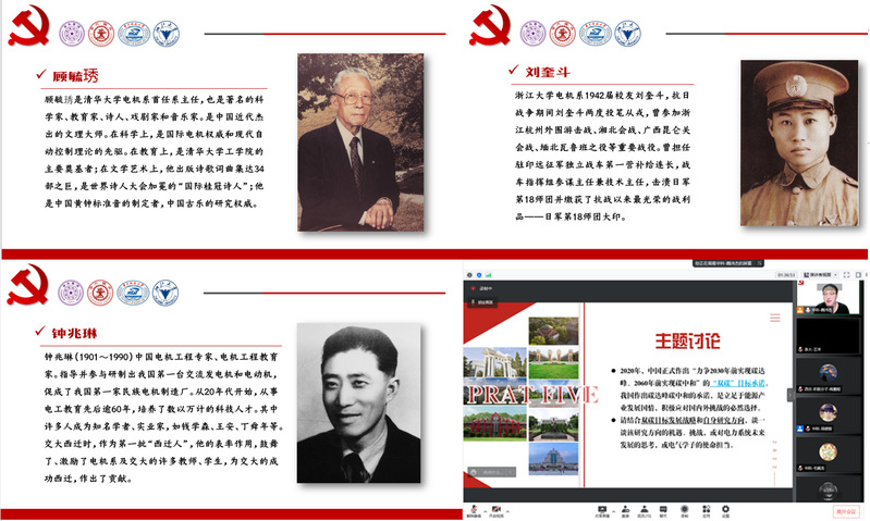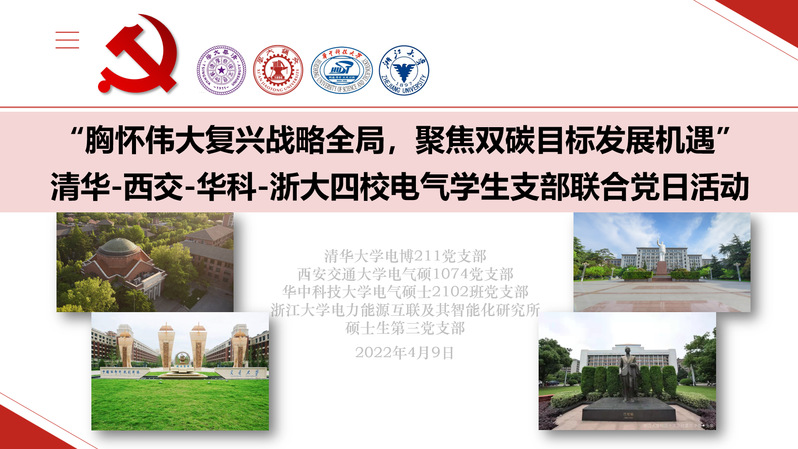 4月9日晚,学院电力智能化研究所硕士生第三党支部与清华大学电博211党支部、西安交通大学电气硕1074党支部及华中科技大学电气硕士2102班党支部联合开展了主题为“胸怀伟大复兴战略全局,聚焦双碳目标发展机遇”的主题党日活动。